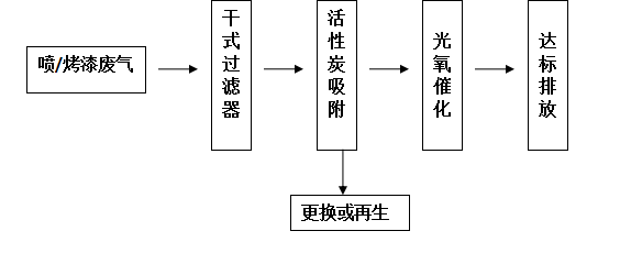 根據我公司大量處理該類廢氣的經驗,最有效的方法是吸附法與光氧催化的綜合治理,根據維修企業的實際情況,綜合考慮各因素,采取以下治理工藝: